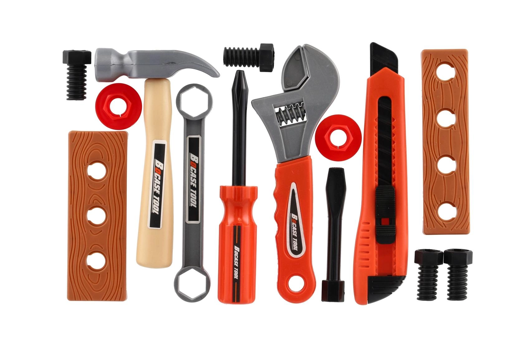 Leichte Kunststoffwerkzeuge mit abgerundeten Kanten sind ideal für die ersten Erfahrungen mit Werkzeug. Kinder können gefahrlos Hämmern, Anziehen und Messen üben.