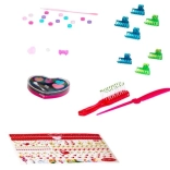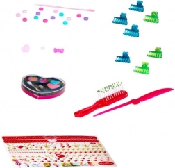 Im Set enthalten sind Kamm, Bürste, kleine Clips, Perlen, Bänder, Aufkleber und eine Palette – alles zum Stylen und Verzieren.