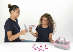 Diese Kollektion von Friseurbedarf der Firma Klein ist hauptsächlich für Mädchen bestimmt. Sie bietet eine breite Palette von Produkten, die sich hervorragend ergänzen. Kinder können durch das Spielen Situationen aus der Erwachsenenwelt nachahmen. Stylinggeräte wie Föhn oder Glätteisen ahmen die Arbeit echter Geräte nach und sind mit besonderer Sorgfalt hergestellt, damit Mädchen Frisuren nicht nur für ihre Puppen, sondern auch für ihre Mamas oder Freundinnen kreieren können. Der Föhn bläst Luft, aber wird nicht heiß. Kamm, Bürste und Haarnadeln haben abgerundete Enden, um sicher damit spielen zu können.