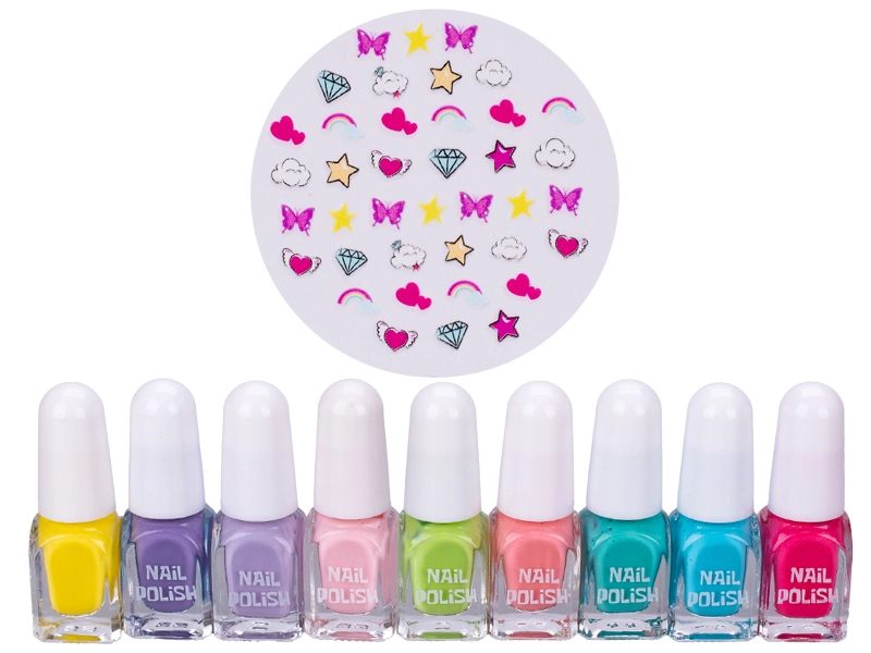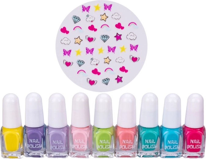 In der praktischen Verpackung finden Sie 9 Mini-Lacke (2,1 ml) und 8 lustige Aufkleber, mit denen Sie niedliche Muster und unzählige Kombinationen kreieren. Die Lacke lassen sich leicht auftragen und entfernen, sodass die Maniküre schnell, spielerisch und sorgenfrei ist.