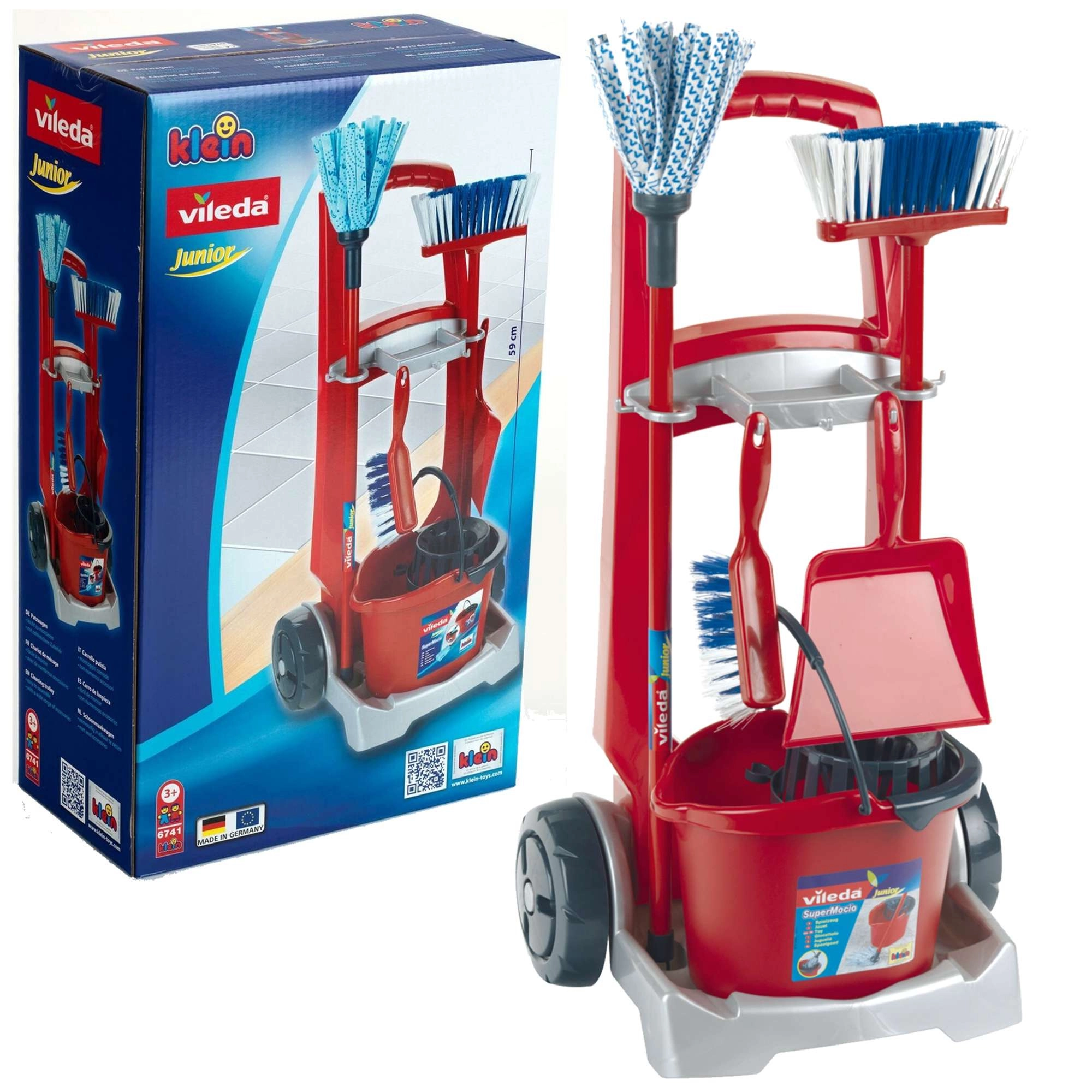 Der Kinder-Putzwagen Vileda von der Marke Klein ist ein umfangreich ausgestattetes Set für realitätsnahes Rollenspiel im Haushalt. Enthalten sind ein Wagen mit Rollen, ein Eimer mit Auswringaufsatz, ein Mopp, ein Besen, eine Handbürste und eine Kehrschaufel. Unterstützt Rollenspiel, lehrt Kinder Ordnung und Verantwortung und garantiert dank der robusten Ausführung eine lange Lebensdauer.