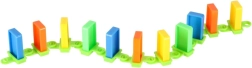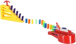 Lieferumfang: 126× Dominosteine (4 Farben), 2× Flugzeug mit Launcher, Streckenteile, 2× Kugel, 1× Figur, 12× Domino-Ständer, 52× Lernaufkleber (Buchstaben, Zahlen, mathematische Zeichen).