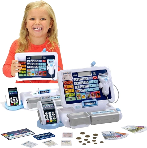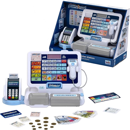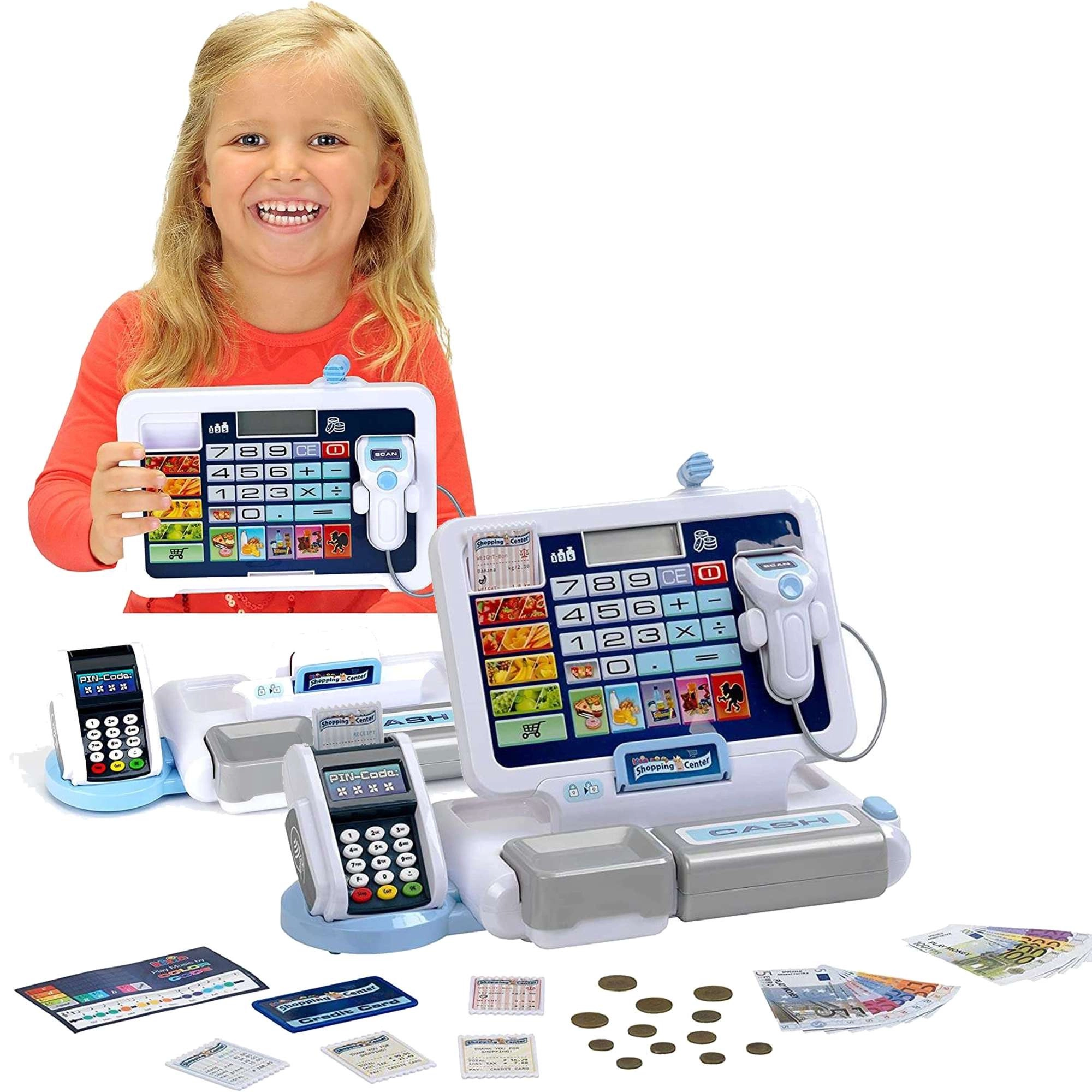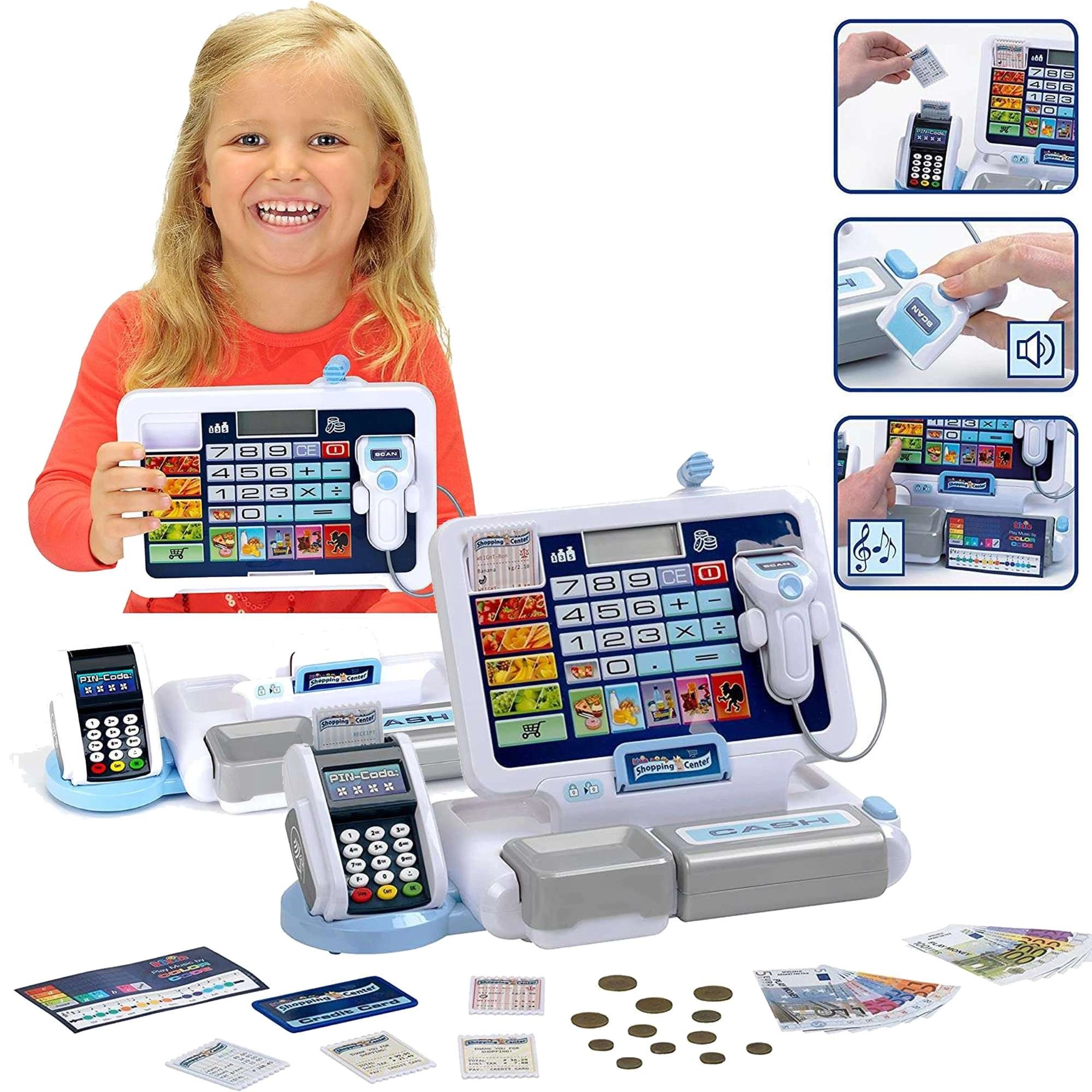 • Realistische Funktionen: Display mit Taschenrechner, Scanner, Kartenleser, Kassengeräusche.