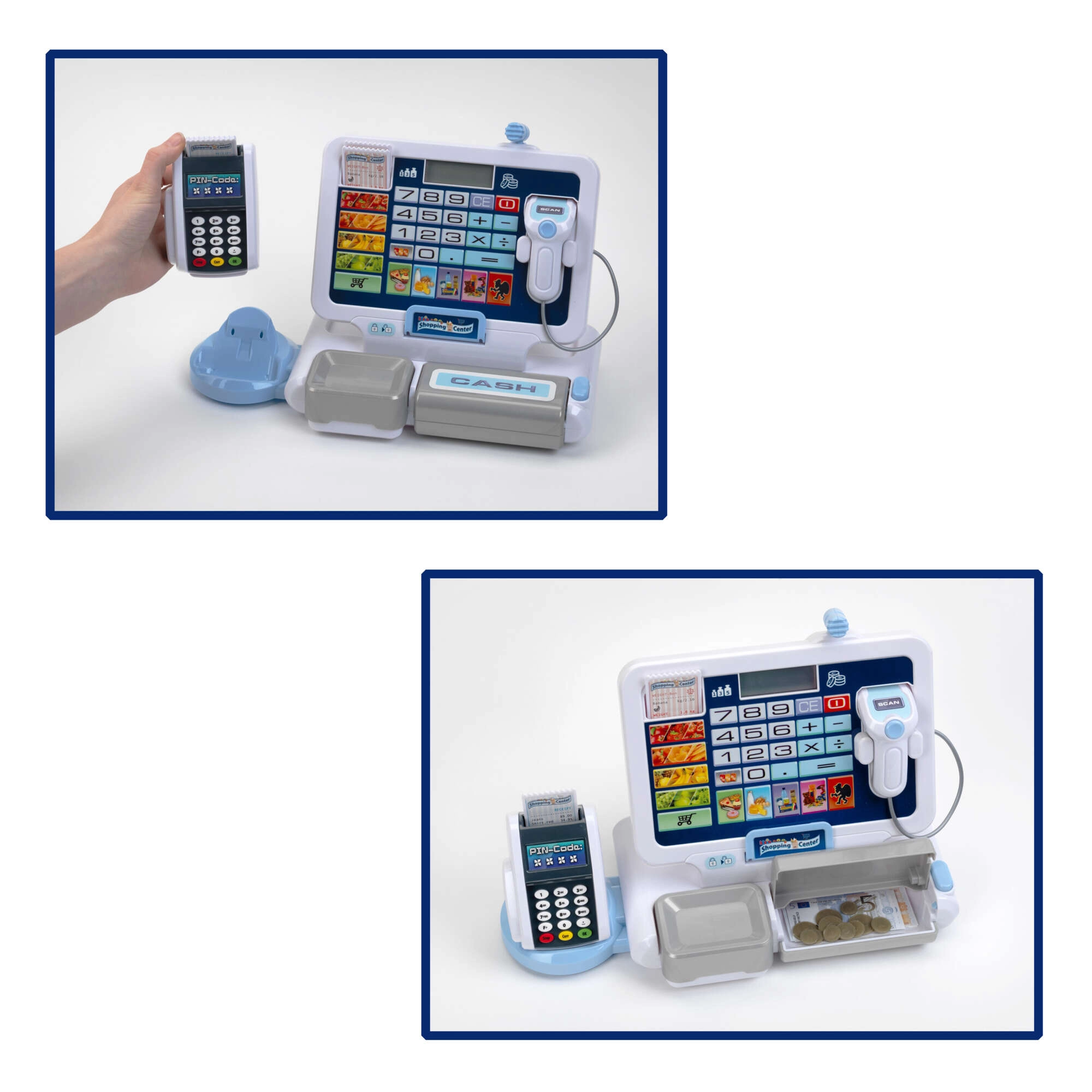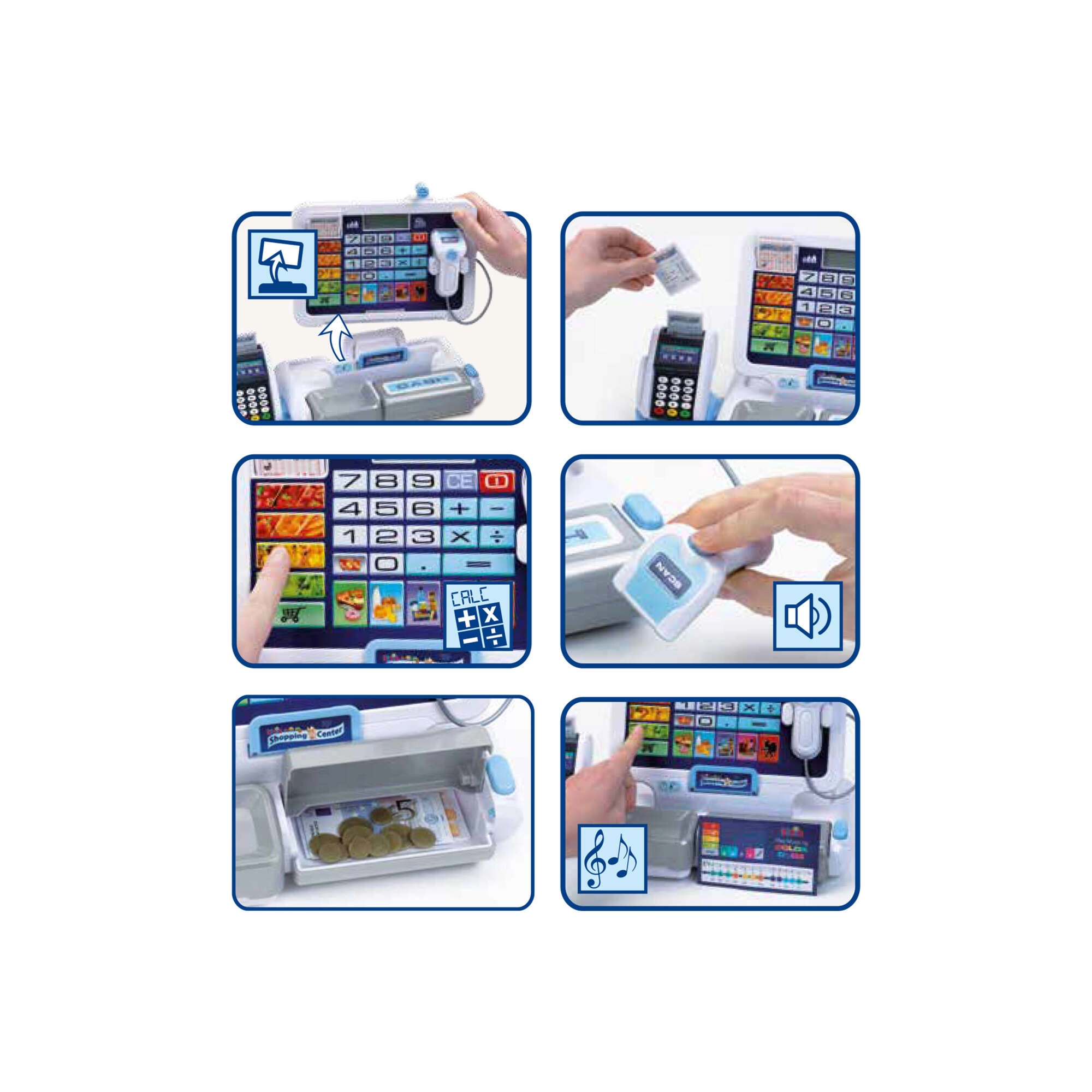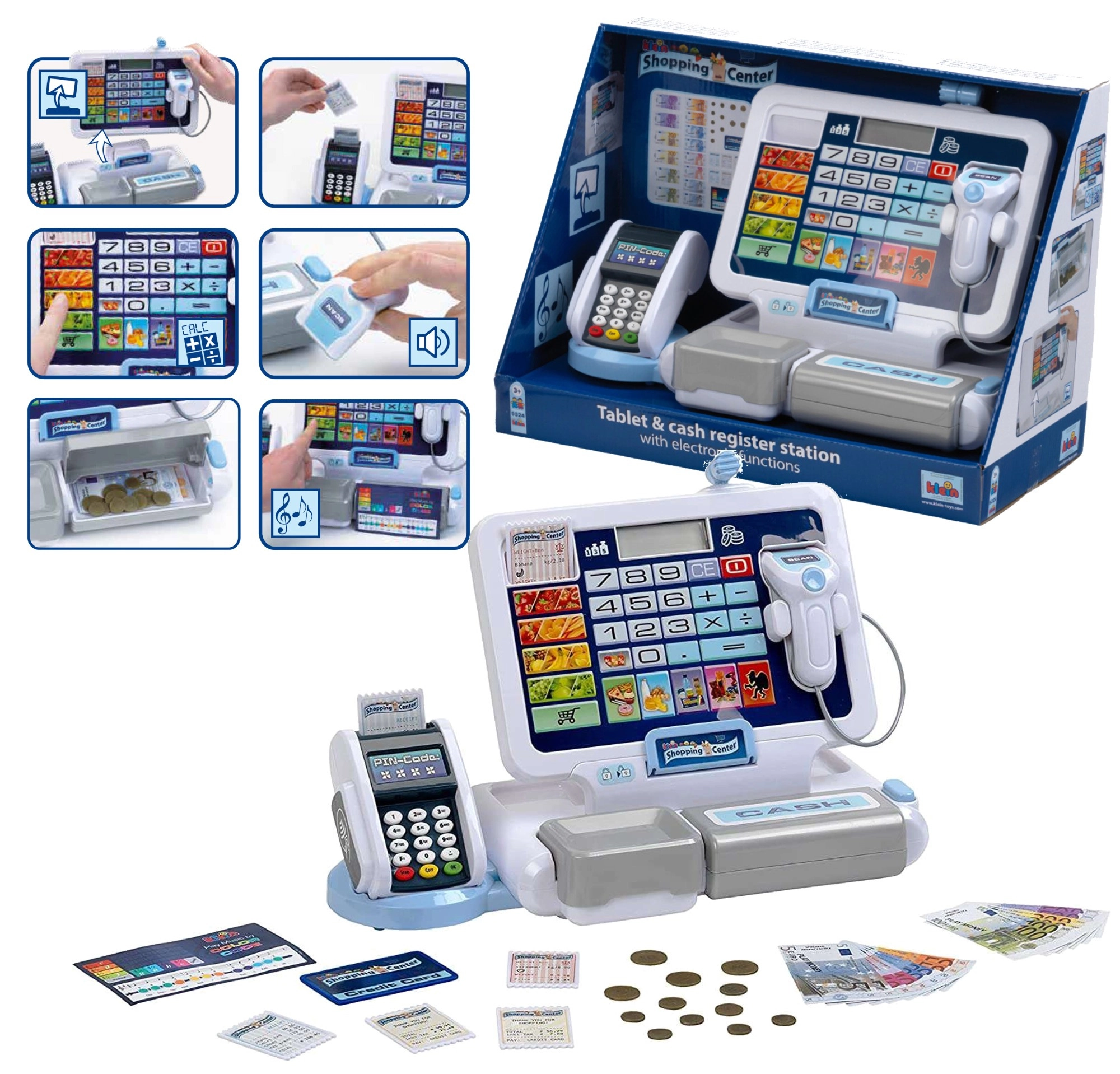 • Realistische Funktionen: Display mit Taschenrechner, Scanner, Kartenleser, Kassengeräusche.