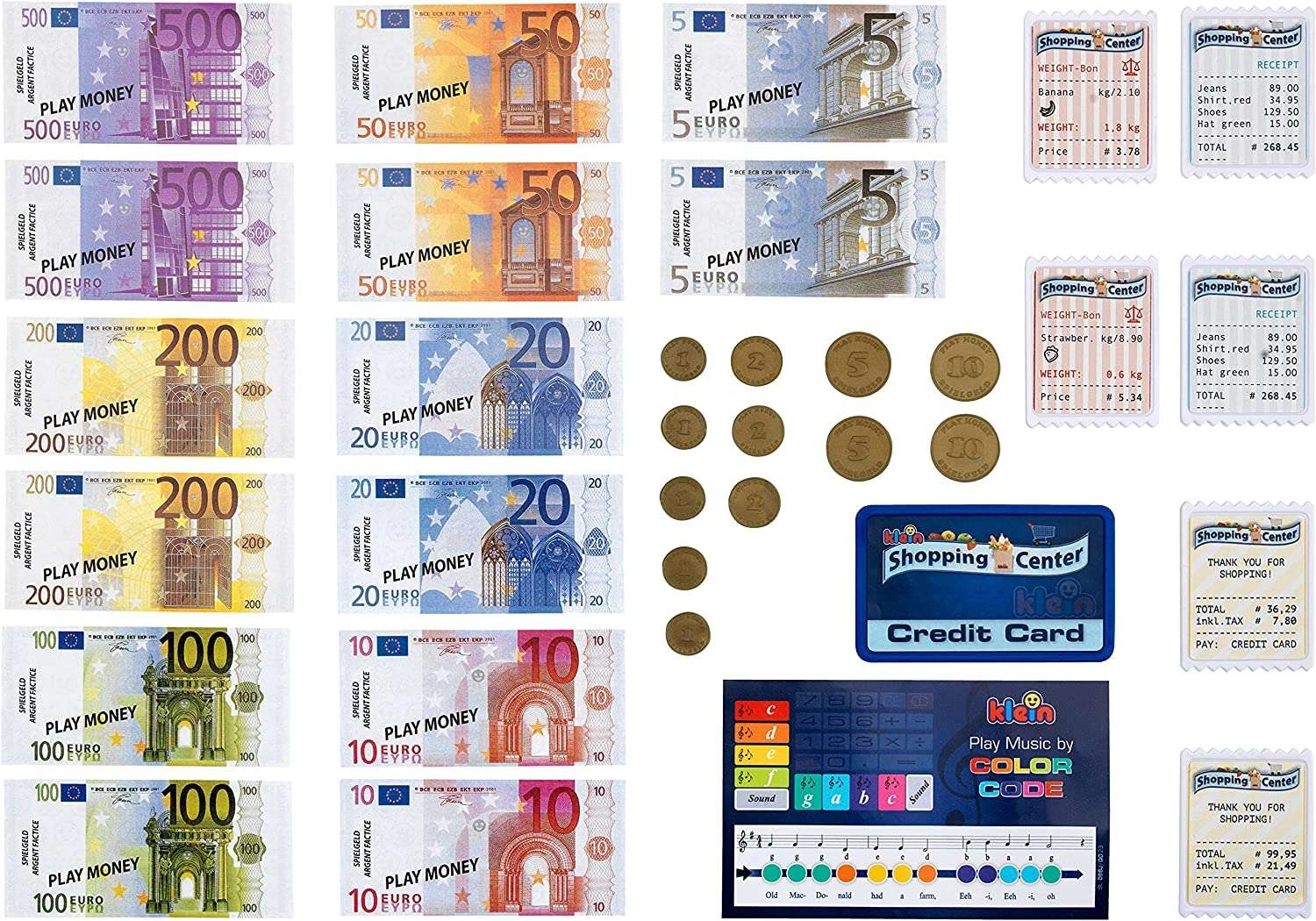 Das Set enthält Kartonmünzen, Papierscheine, mehrere Kassenbons, eine Zahlungskarte und eine Liedkarte – alles für komplettes Kaufladen-Spiel.