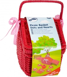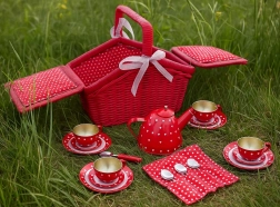 Der bezaubernde Picknickkorb mit Punkt- und Herzmotiven birgt ein Teeservice aus Blech, bereit für jede imaginäre Teestunde. Die stabile Ausführung mit verstellbaren Klettbändern und Textilrand sorgt für mühelosen Transport und einfache Aufbewahrung aller Teile. Kinder trainieren soziale Interaktion, Motorik und Kreativität.