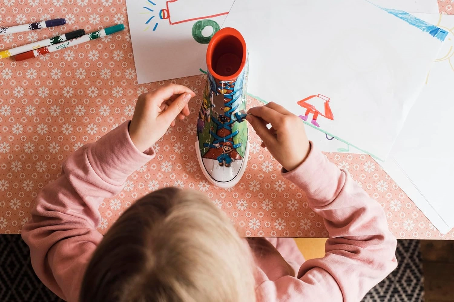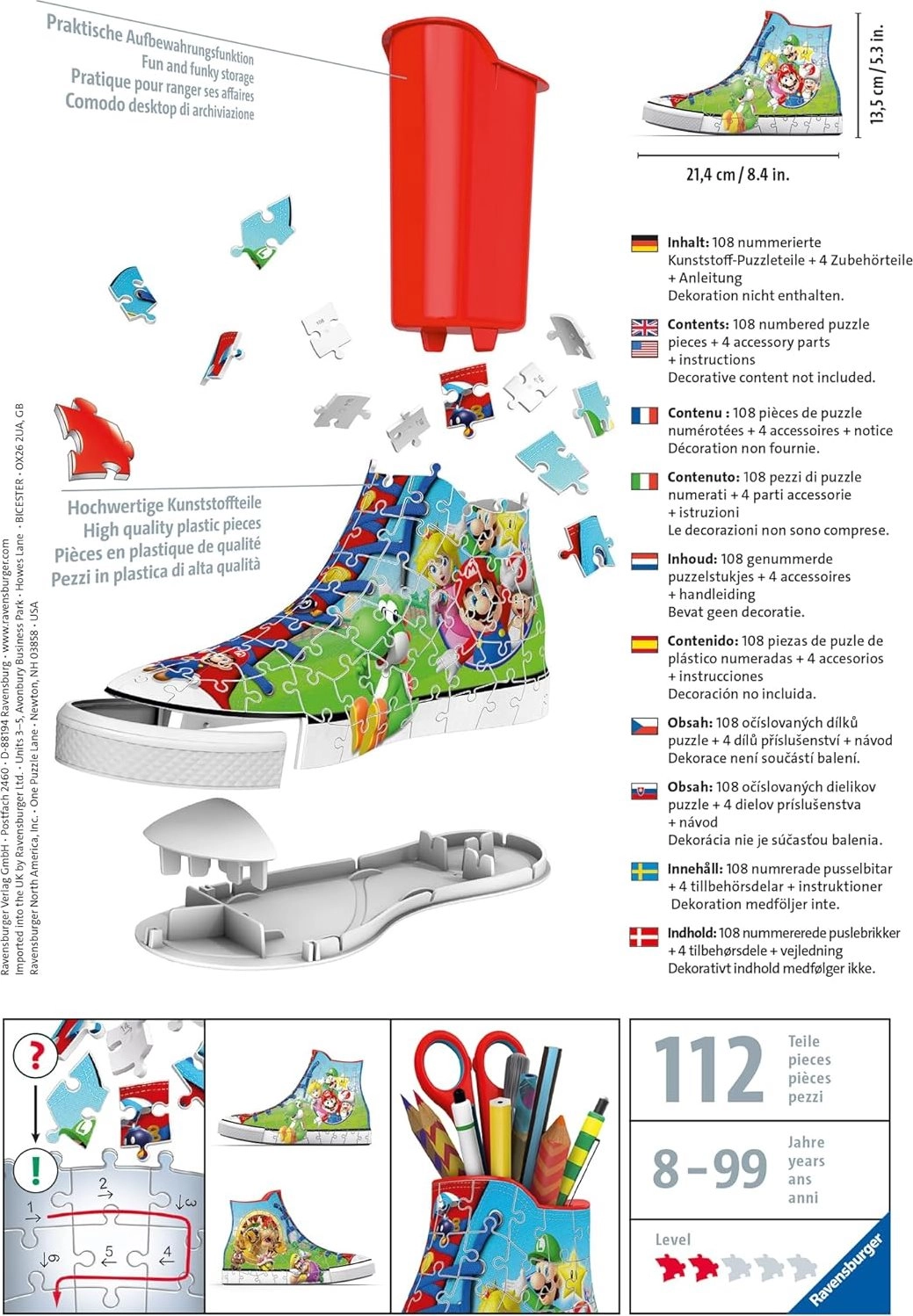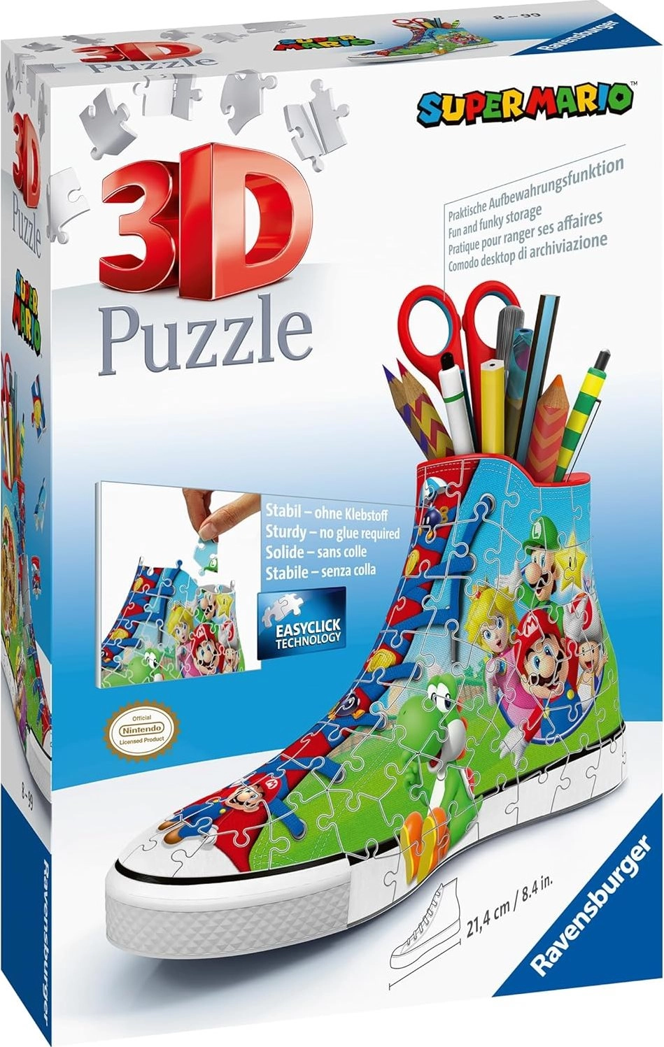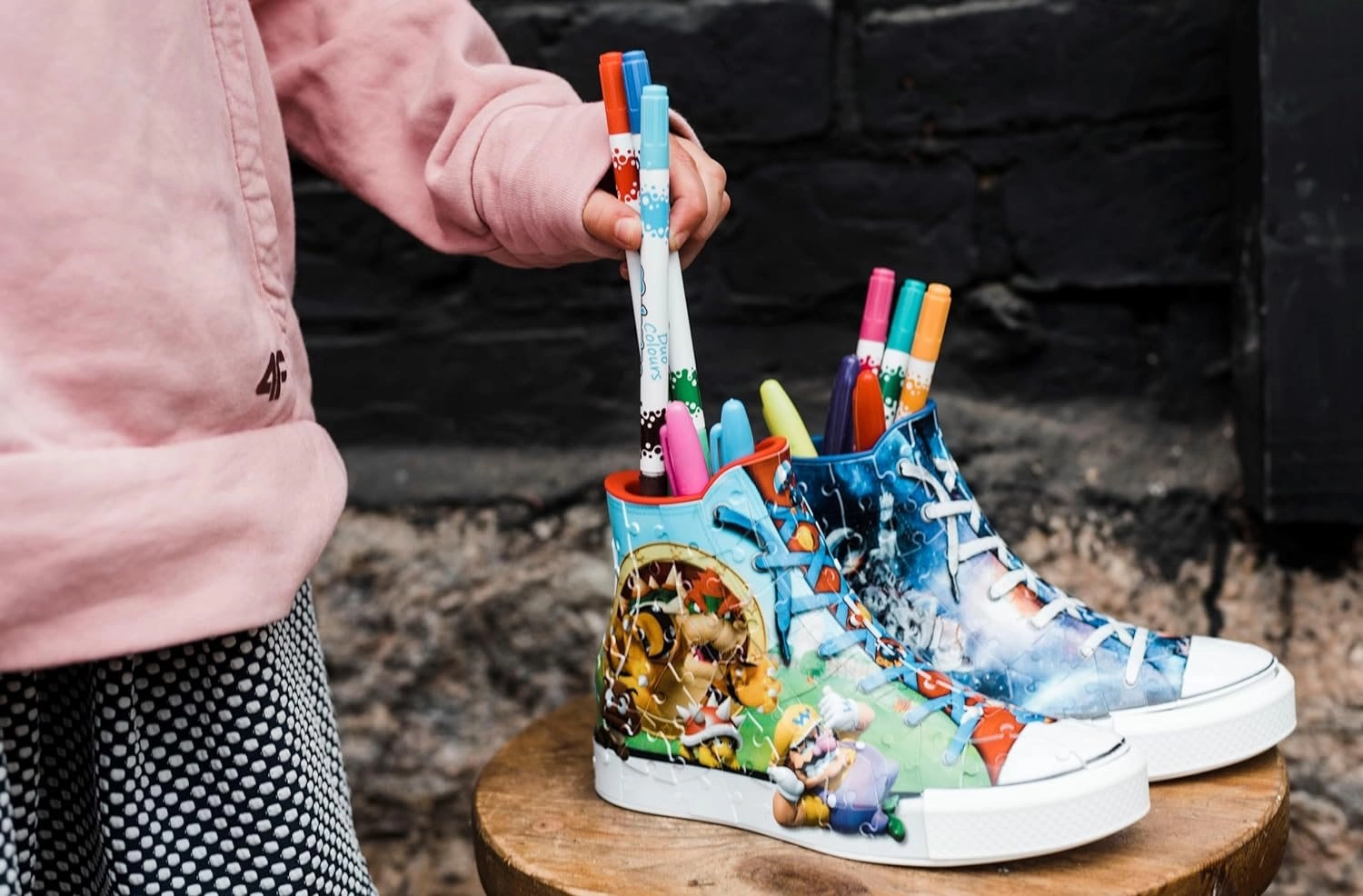 Baue aus 108 Kunststoff-Puzzleteilen diesen klassischen Sneaker mit Super-Mario-Motiv und erhalte eine perfekte Deko für dein Zimmer! Nach dem Zusammenbau wartet ein weiterer Bonus auf dich: Du kannst ihn für Pinsel, Stifte usw. verwenden.