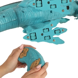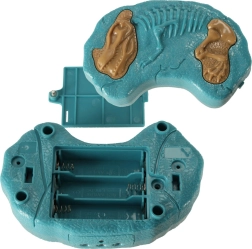 Der Fernbedienung in Form einer Versteinerung mit zwei Tasten erleichtert die Steuerung der Bewegungen und Geräusche des Dinosauriers.