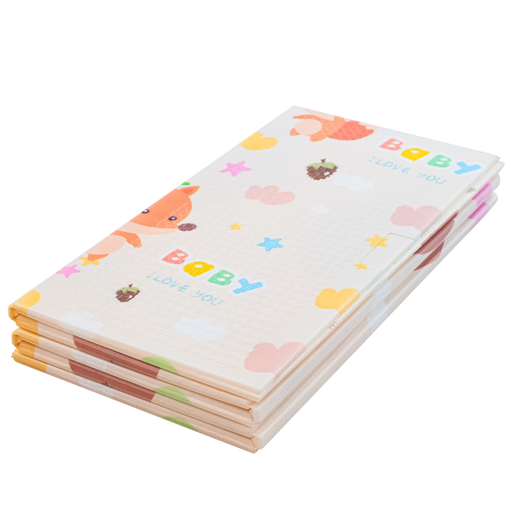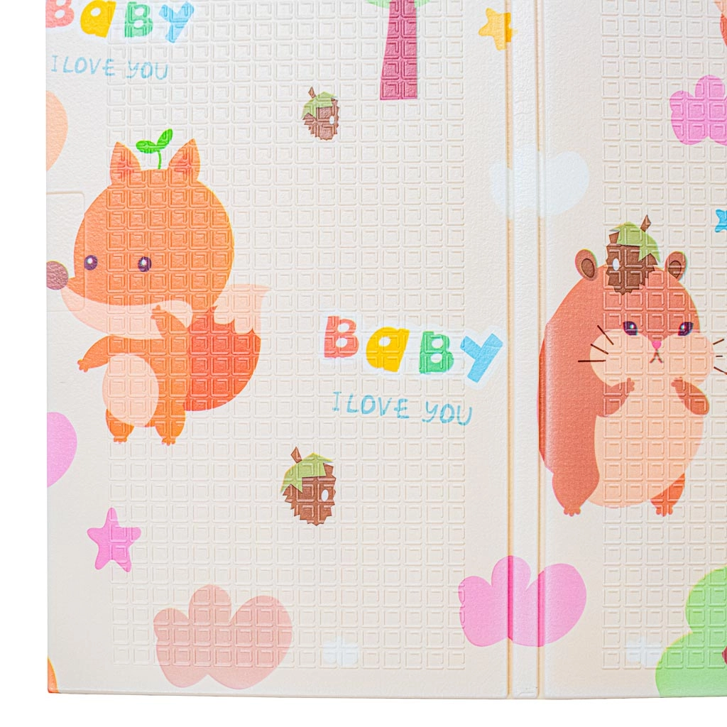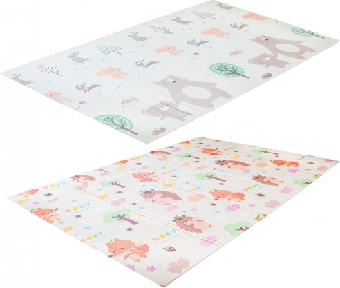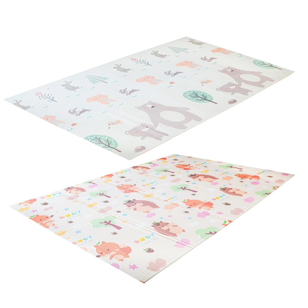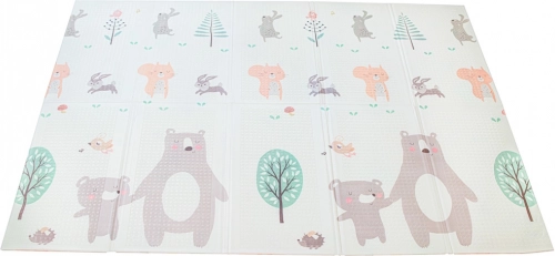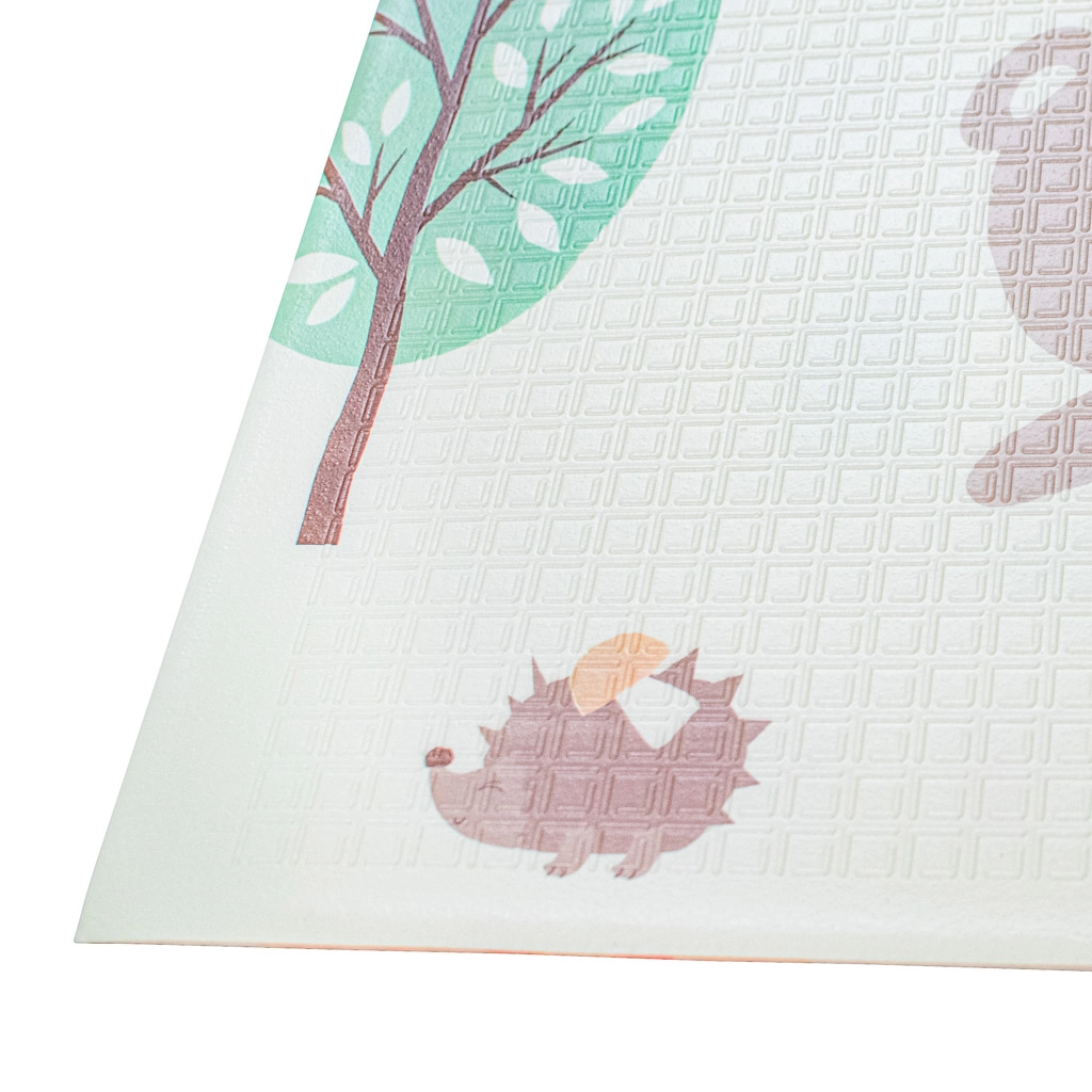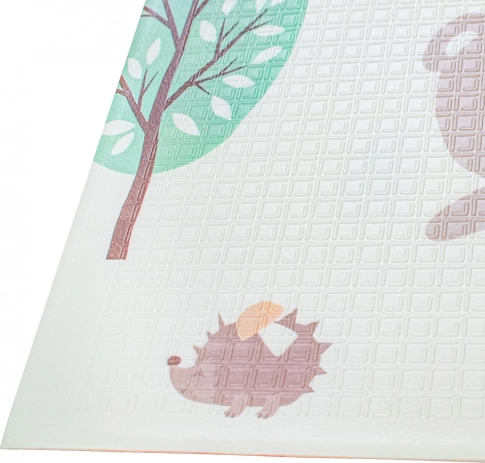 Die Matte verfügt über beidseitigen Druck: Auf der einen Seite sind niedliche Tiere wie Bären und Hasen, während auf der anderen Seite Igel und Füchse erscheinen.