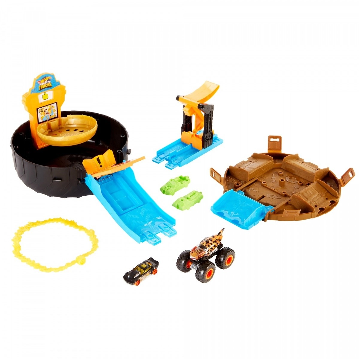 Im Lieferumfang sind der Monster Truck Tiger Shark und ein Hot Wheels Auto im Maßstab 1:64 enthalten – einfach aufklappen und mit dem Wettkampf starten.