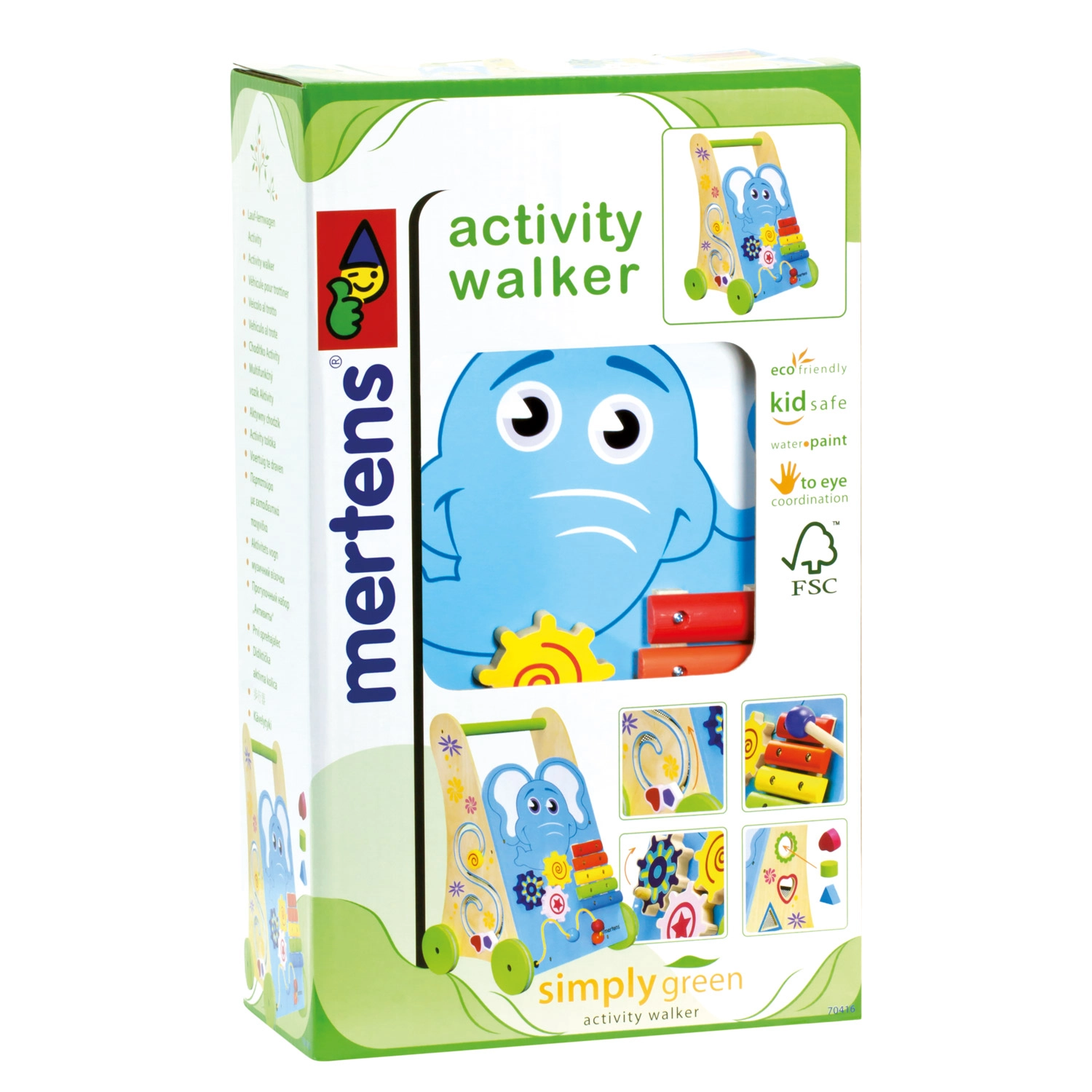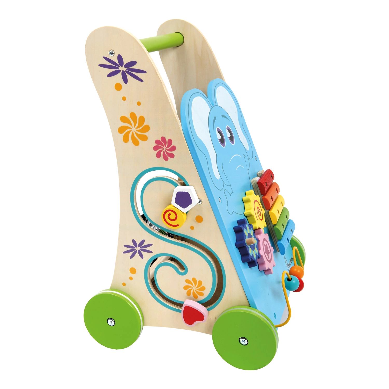 Unterstützen Sie die ersten Schritte und die ganzheitliche Entwicklung Ihres Kleinkinds mit diesem stabilen Holz-Lauflernwagen mit Aktivitäten. Er bietet ein sanft klingendes Xylophon, einen Perlenlabyrinth, eine Formen-Steckbox und Zahnräder zum Entdecken von Ursache und Wirkung. Gummierte Räder sorgen für leises Rollen und schonen den Boden; die robuste Konstruktion aus 100% FSC-Holz ist sicher und langlebig.