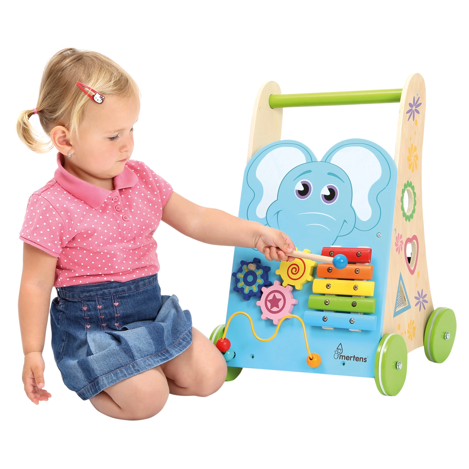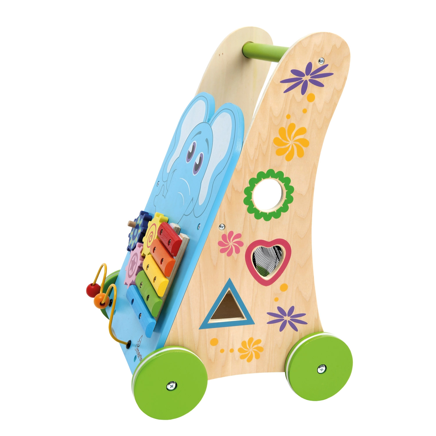 Xylophon mit Schlägel, Zahnräder, Perlenlabyrinth und Steckspiel fördern Feinmotorik, Hörwahrnehmung und Logik in einem kompakten Lauflernwagen.