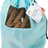 Der türkisfarbene Beutel mit Netzfenster ermöglicht einen einfachen Transport und eine platzsparende Aufbewahrung des Seils nach dem Spiel.