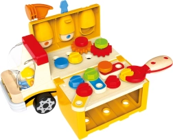 Der robuste Lkw kombiniert Holz und Kunststoff für lange Lebensdauer und leichtes Handling. Die kippbare Ladefläche sorgt für realistische Spielelemente.