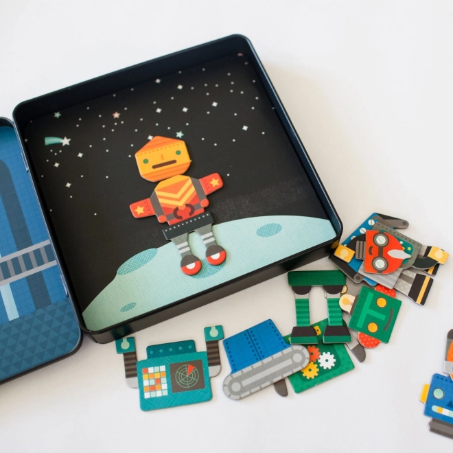 Das Magnetset mit Robotern bietet tollen Spaß für Kinder ab 3 Jahren. Dank der mehr als 25 magnetischen Teile können kleine Konstrukteure unendlich viele Kombinationen von Roboterfiguren zusammenstellen und so Fantasie und Kreativität entwickeln. Die Blechdose lässt sich fest verschließen und verbirgt im Inneren zwei farbige Szenen, an denen die Teile leicht haften.
