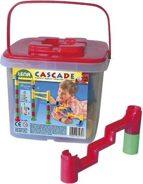 Entdecken Sie das kreative Bauset Cascade im praktischen Eimer mit Griff. Kinder können eigene Bahnen bauen und dann eine Kugel rollen lassen, die über verschiedene Ebenen läuft. Dieses Spielzeug fördert die Feinmotorik, das logische Denken und die Kreativität – idealer Spaß für kleine Konstrukteure.