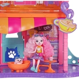 Tauche ein in die Welt der ENCHANTIMALS mit einem zauberhaften Stadthaus, 70 cm hoch, mit drei Etagen voller Spielmöglichkeiten. Es erwarten dich ein Café mit Patio, ein Wohnzimmer mit Küche, ein Schlafzimmer und ein Pool auf dem Dach. Außerdem gibt es einen Balkon, eine Feuertreppe und eine Eingangstür mit Klappe für das Haustier. Enthalten sind die Puppe Palmer Pomeranian (15 cm), ihr Hündchen Pommy und mehr als 15 Zubehörteile für grenzenlose Fantasie und kreatives Spielen. Mehr Spielzonen, reichhaltiges Zubehör und märchenhaftes Design begeistern kleine Geschichtenerzähler.