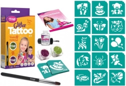 Sorge auf der Geburtstagsparty für eine einzigartige Atmosphäre mit den TyToo Happy Birthday Glitzertattoos. Das Set enthält 15 Schablonen mit fröhlichen Motiven und 2 Glitzerfarben, die auf der Haut etwa 8–18 Tage halten. Die Tattoos sind wasserfest, lassen sich jedoch leicht mit Alkohol oder Babyöl entfernen. Fertige Motive kannst du mit selbstklebenden Steinchen oder Wackelaugen für einen noch auffälligeren Effekt verzieren.