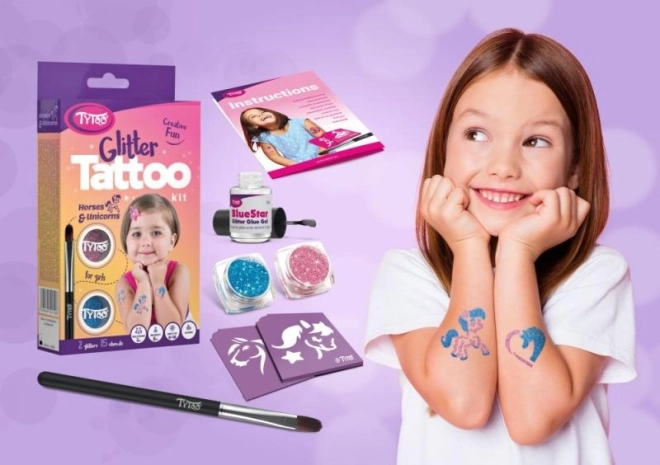 Genießen Sie den Zauber glitzernder Tattoos mit schönen Motiven von Pferden, Ponys und Einhörnern dank des TyToo-Sets. Nutzen Sie die einzigartigen Designs, die je nach Hauttyp und sorgfältiger Handhabung bis zu 18 Tage auf der Haut halten. Größere Sets enthalten bewegliche Augen und selbstklebende Steinchen, die Sie auf der Haut anbringen können, um ein einzigartiges Design zu vollenden.
