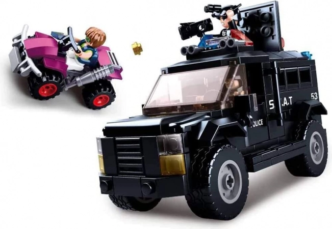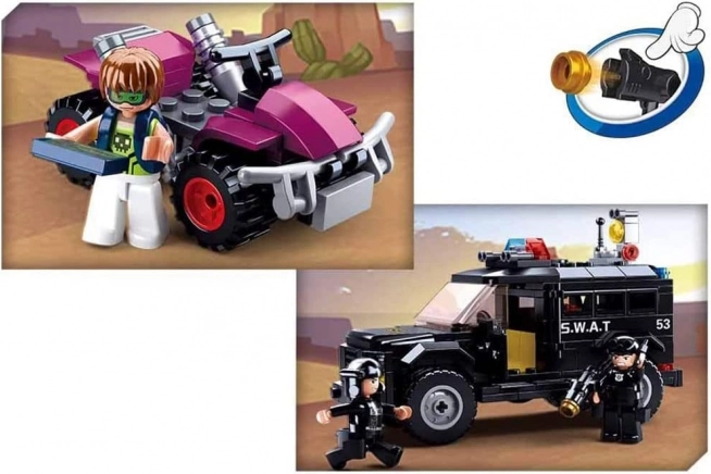 Dieses actionreiche SLUBAN POLICE Bauset bietet alles für dramatische Polizeieinsätze: ein robustes SWAT-Fahrzeug, das ATV-Quad des Flüchtigen und drei detailreiche Figuren mit Zubehör. Dank hochwertigem ABS-Kunststoff ist das Modell langlebig und bereit für viele Stunden Spielspaß.