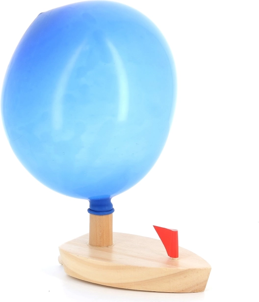 Pusten Sie den Ballon auf und beobachten Sie, wie sich das Boot aufgrund des einfachen Luftantriebs über das Wasser bewegt.