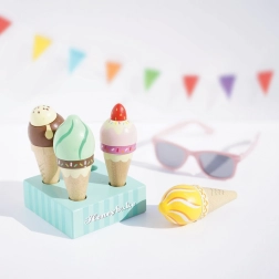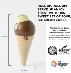 Das Spiel mit Eiscreme fördert auf natürliche Weise Kreativität, soziale Fähigkeiten und Kommunikation. Die robuste Konstruktion aus nachhaltig gewonnenem Holz und die ethische Herstellung sorgen für Langlebigkeit im täglichen Gebrauch. Dank realistischer Details werden Kinder zum Servieren, Portionen zählen und zum Erfinden eigener Geschmacksrichtungen angeregt.