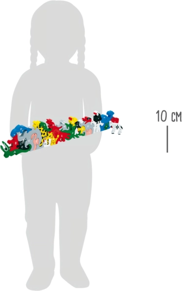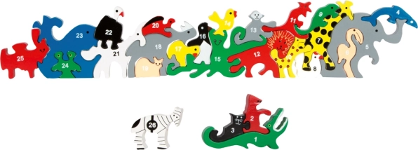 Es besteht aus 26 Teilen, jedes repräsentiert ein Tier und ist auf der einen Seite mit einer Zahl und auf der anderen mit einem Buchstaben des Alphabets versehen. Es fördert die Feinmotorik und entwickelt kreatives Denken.