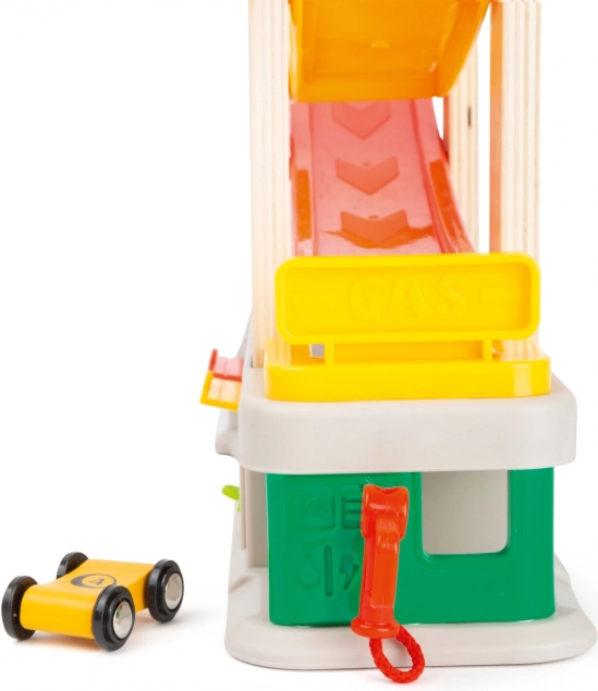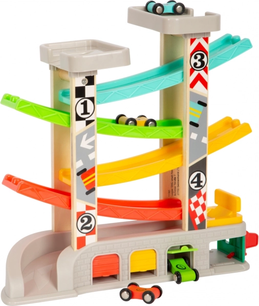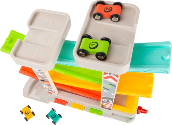 Die Rennbahn enthält verschiedene Ebenen und bunte Autos, die für ein unterhaltsames und lehrreiches Spiel sorgen.