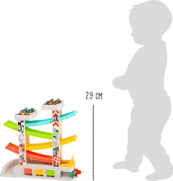 Die Bahn ist so konzipiert, dass sie Nachahmungsfähigkeiten und feine Motorik entwickelt, während Kinder mit vier verschiedenfarbigen Autos Rennen fahren. Außerdem können kleine Rennfahrer dank des praktischen Park- und Lagersystems ihre Autos nach dem Rennen einfach aufräumen.