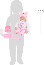 Das umfangreiche Zubehör umfasst Schnuller, Fläschchen, Tellerchen mit Besteck und Töpfchen in harmonierenden Farben. Kinder können Füttern, Wickeln und Hygienerituale spielerisch im Rollenspiel üben. Die Kleidung ist für einfaches Umziehen gestaltet, sodass auch kleine Hände die Puppe gut handhaben können.