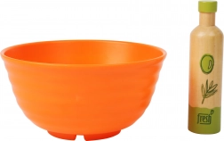 • Komplett-Set – Schüssel, „Öl“, Servierzange/Löffel und verschiedene Gemüsescheiben.