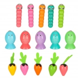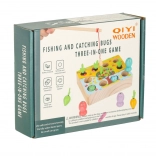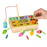 Nehmen Sie Ihr Kind mit an den Teich und in den Garten – ganz ohne das Haus zu verlassen. Die massive Holz-Basis verbirgt Öffnungen für Fische, Würmchen und bunte Möhrchen. Kinder angeln sie mit der magnetischen Angel oder ziehen sie an den Filzblättchen heraus und trainieren dabei ganz natürlich den Pinzettengriff und das Fingerspitzengefühl.