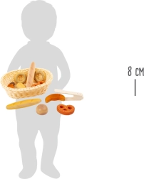 Der geflochtene Korb mit Holz-Backwaren in natürlichen Farbtönen fördert die Fantasie und Ästhetik des kindlichen Spiels.