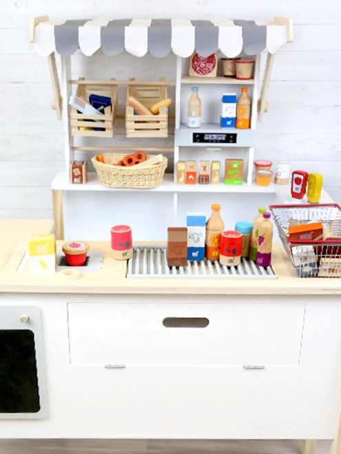 Das perfekte Zubehör für Kinderküche oder Kaufladen: Kinder können „verkaufen“, „servieren“ und „probieren“, ihren Wortschatz, soziale Kompetenzen und Fantasie erweitern. Die hochwertige Holzverarbeitung mit glatten Kanten sorgt für Langlebigkeit und sicheres Spiel.