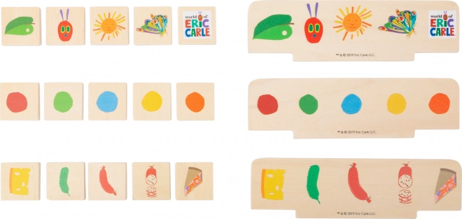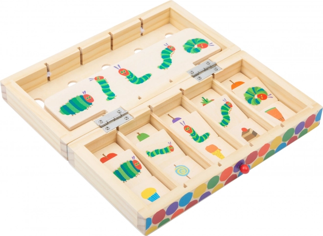 Das Design mit dem beliebten Motiv Die kleine Raupe Nimmersatt zieht Kinder sofort in den Bann. Plättchen und Deckel sind leicht zu handhaben, und die robuste Holzverarbeitung garantiert eine lange Lebensdauer. Nach dem Spielen einfach mit dem Gummiband verschließen – nichts fällt heraus.