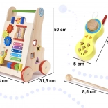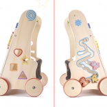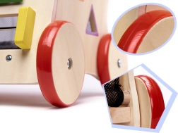 Alle Teile des Lauflernwagens sind sorgfältig geschliffen, um kleine Hände vor Splittern zu schützen, und mit ungiftigen, umweltfreundlichen Farben bemalt. Die Konstruktion ist stabil, mit Holzrädern, die mit Gummi ummantelt sind, um mehr Sicherheit zu bieten. An den Seiten des Lauflernwagens befinden sich außerdem ein Formsortierer mit vier bunten Würfeln und ein Labyrinth mit niedlichen Tieren.