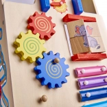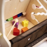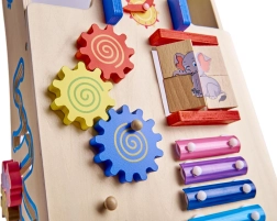 An der Vorderseite befindet sich ein Brett, das voller interaktiver Elemente zur Sinnesentwicklung des Kindes ist, darunter Uhren, Zahnräder und Glockenspiele.