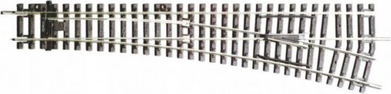 Weiche mit detailgetreuer Nachbildung der Holzschwellen in authentischen Farben. Kombiniert ein gerades Gleis und einen 15°-Bogen nach rechts und kann manuell bedient werden. Möglichkeit zum Anschluss eines ferngesteuerten Antriebs.