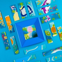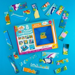 Die progressiven CAROTINA Baby Puzzles schenken Kindern schon von den ersten Versuchen an Freude am Puzzeln. Jedes der 8 Puzzles hat eine unterschiedliche Teileanzahl und steigert den Anspruch fließend, sodass das Kind seine Fähigkeiten ohne Frustration natürlich entwickelt. Thematische Bilder aus der Unterwasserwelt motivieren zum Entdecken und Spielen.