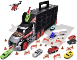 Der riesige LKW-Koffer kombiniert Aufbewahrungsbox und Spielset in einem. Die aufklappbaren Fächer fassen das komplette Set an Fahrzeugen und Zubehör, und der praktische Griff erleichtert das Tragen. Die manuelle Launch-Mechanik in der Kabine verwandelt den LKW in eine Rennstrecke und sorgt für actiongeladene Starts.