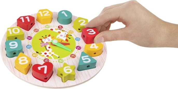 Bunte Holzlern-Uhr mit herausnehmbaren Zahlen in verschiedenen Formen – ideal für die ersten Lernschritte. Kinder üben Form- und Farberkennung, Zählen, Uhrzeit lesen sowie die Feinmotorik. Sichere Verarbeitung, 12 Holzteile, bewegliche Zeiger und eine Fädelschnur sorgen für viel Spaß und Förderung.