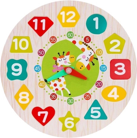 Dieses hölzerne Lernspielzeug verbindet Spielen und Lernen. Die runde Basis mit den Zahlen 1–12 in unterschiedlichen Formen lehrt Kinder, Formen zuzuordnen, Farben und Ziffern zu erkennen, während die beweglichen Stunden- und Minutenzeiger das Verständnis für volle Stunden und Minuten fördern. Robuste Holzteile liegen gut in der Hand und sind sicher verarbeitet.