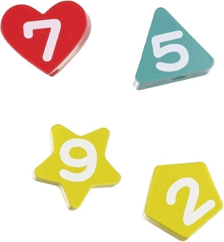 Inklusive Schnur mit Holzgriff. Das Auffädeln der Zahlen trainiert Geduld, Konzentration und Fingerfertigkeit.