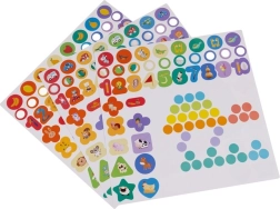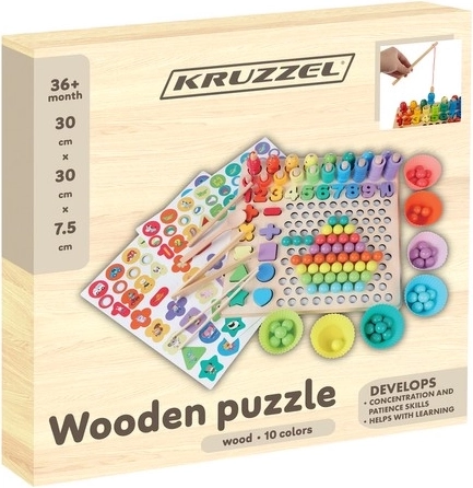 Das Set enthält zweiseitige Vorlagen, Ziffern, mathematische Symbole sowie farbige Ringe und Kügelchen zum Legen von Mustern. Dank der Holzgrundlage ist das Spielzeug robust und stabil, die leuchtenden Farben motivieren zur Kreativität und das Kind erwirbt spielend die Grundlagen der Mathematik.