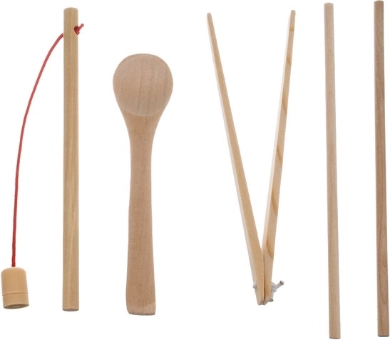 Holzgrundplatte und Elemente: Linde/Holz; Kugeln: Holz; Ringe: PE; Ziffern, geometrische Formen und mathematische Zeichen: MDF; Fische: Holz + Eisen; Förmchen: PE; zweiseitige Karten: Papier; Stäbchen: Holz; Pinzette: Holz; Löffel: Holz; Angel: Holz + PP + PS + Magnet