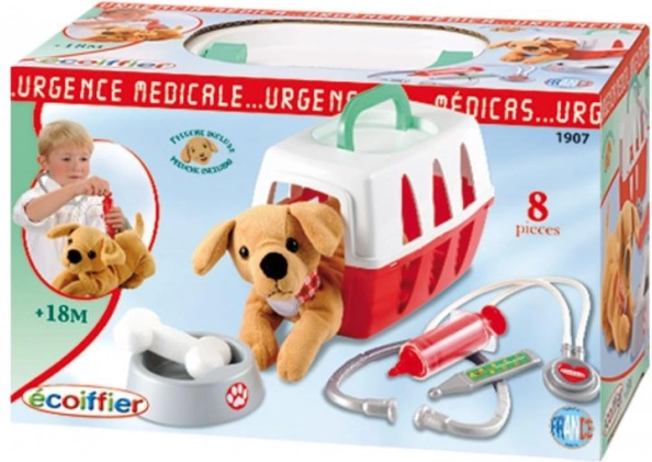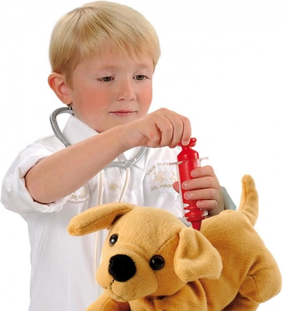 Der Koffer lässt sich im Handumdrehen in eine Transportbox für den Hund verwandeln und hält zugleich sämtliches Zubehör beisammen. Enthalten sind ein Napf für den Hund, ein Knochen und grundlegendes Arztzubehör für eine fantasievolle Versorgung des Lieblings.