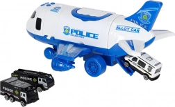 Polizei-Flugzeugtransporter mit 3 Autos und Verkehrsschildern