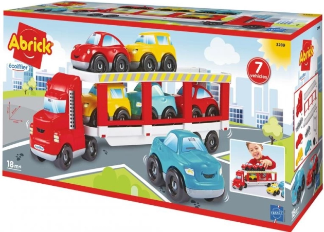 Attraktiver Abrick Transporter zum Transport von Autos! Der Transporter ist mit einer klappbaren Rampe ausgestattet, die einfaches Be- und Entladen von sechs bunten Autos ermöglicht.