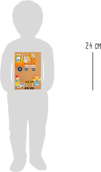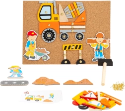 Die Korktafel mit Reißnägeln ermöglicht wiederholtes Zusammenstellen und Umgestalten von Verkehrs- und Bauszenen ganz nach der Fantasie der Kinder.