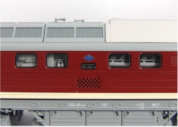 Originalgetreues und detailliertes Modell der diesel-elektrischen Lokomotive BR 132 „Ludmilla“ in DR-Ausführung. Es überzeugt besonders durch die Unterschiede gegenüber anderen Varianten, wie das Frontgeländer, die Details der Front- und Seitenfenster sowie die Dachgestaltung. Farbgebung und Bedruckung, einschließlich sämtlicher Zierlemente, sind von höchster Qualität und entsprechen der Expert-Produktlinie. Das Modell ist mit einem leistungsstarken Motor mit Schwungmassen ausgestattet, das Drehmoment wird über diagonal angeordnete bandagierte Räder auf den inneren Achsen des Drehgestells übertragen, insgesamt werden jedoch vier Achsen angetrieben. Zusammen mit dem langen Zinkdruckgussrahmen sind dadurch hervorragende Fahreigenschaften gewährleistet. Weißes/rotes LED-Licht wechselt richtungsabhängig, zudem ist der Führerstand beleuchtet. Das Modell kann mit einem speziell dafür vorgesehenen Digitaldecoder mit Soundmodul und Lautsprecher aufgerüstet werden. Passende Wagen des entsprechenden Typs und in passender Ausführung sind erhältlich. Hauptmerkmale: Sechs Achsen, Motor mit zwei Schwungmassen, zwei bandagierte Antriebsräder, richtungsabhängiger Lichtwechsel, Innenbeleuchtung, PluX22-Schnittstelle nach NEM 658, NEM-362-Schacht mit Kurzkupplungskinematik. Dokumentation: Broschüre zu den Modellen BR 132/BR 232 (DE), Allgemeine Informationen zur BR 130 (DE, EN, F, NL), Test des Modells im Magazin Miniaturbahnen 2/2018 (DE), Bedienungsanleitung und Ersatzteilliste für Modell Nr. 52760 (DE, EN, F, NL).